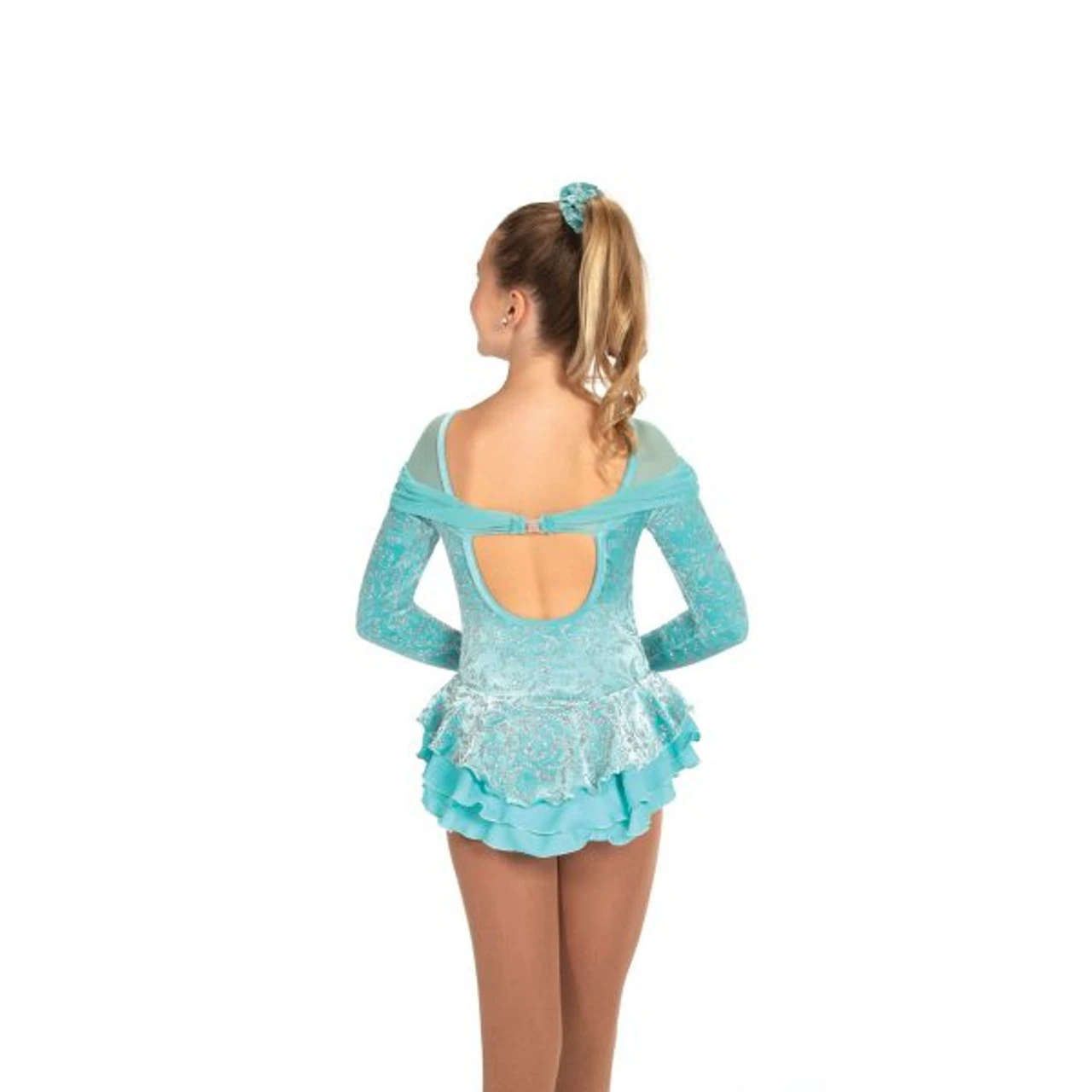 This glitter velvet dress features a flattering sweep of mesh across the shoulders, long glove style sleeves with finger points and a triple layer princess style skirt. Lined.