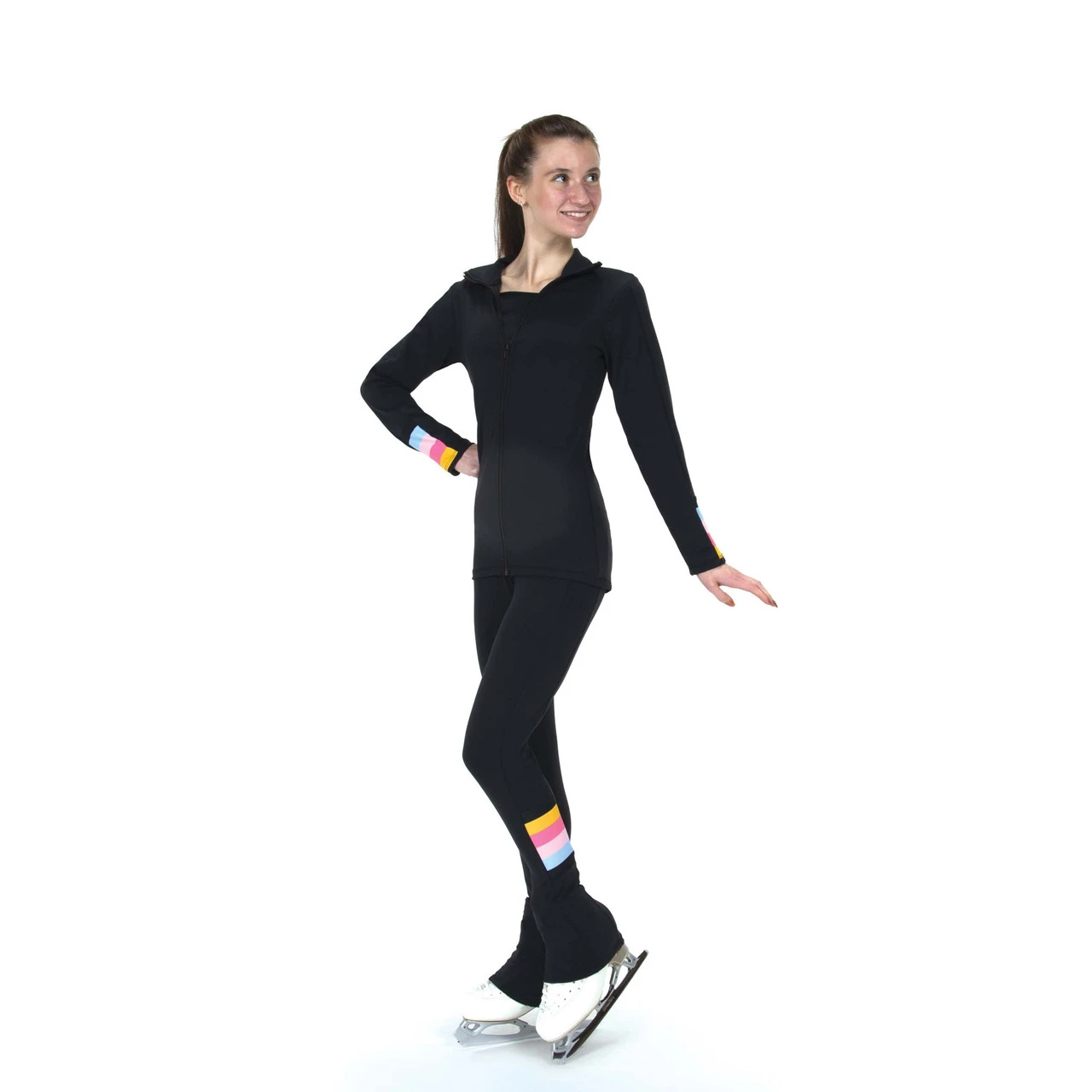 Black supplex jacket with fold over collar, full front zip and striking colour block stripes.