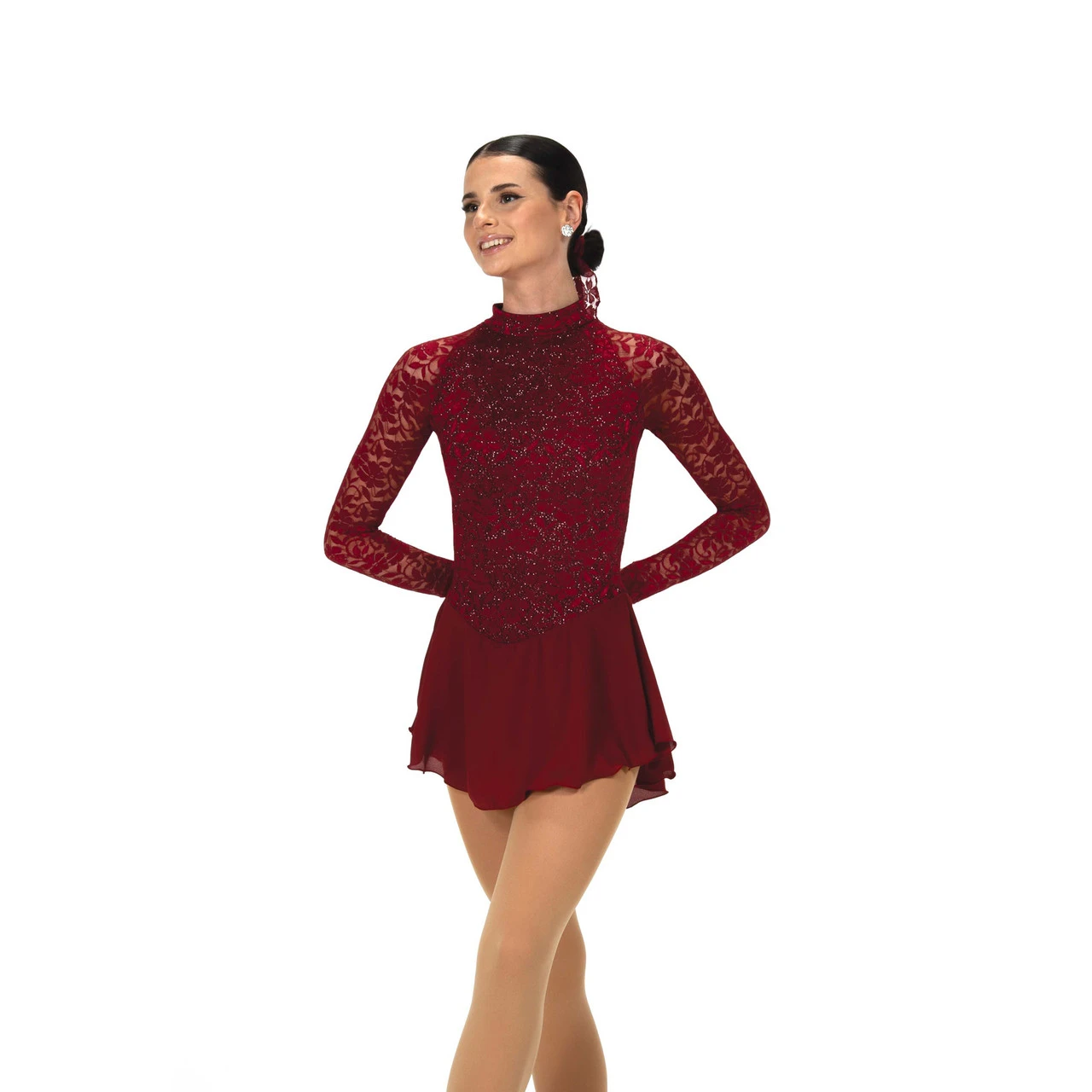 Rich, deeply toned lace dresses feature long lacy sleeves and a lace bodice over glitter, a matching slim skirt and a high neck with a back zipper. Lined.