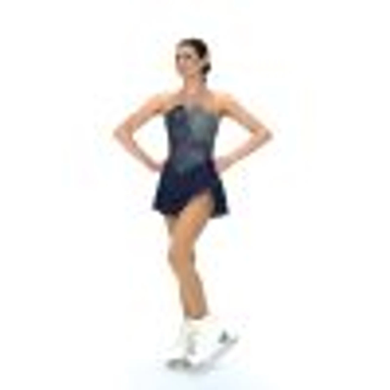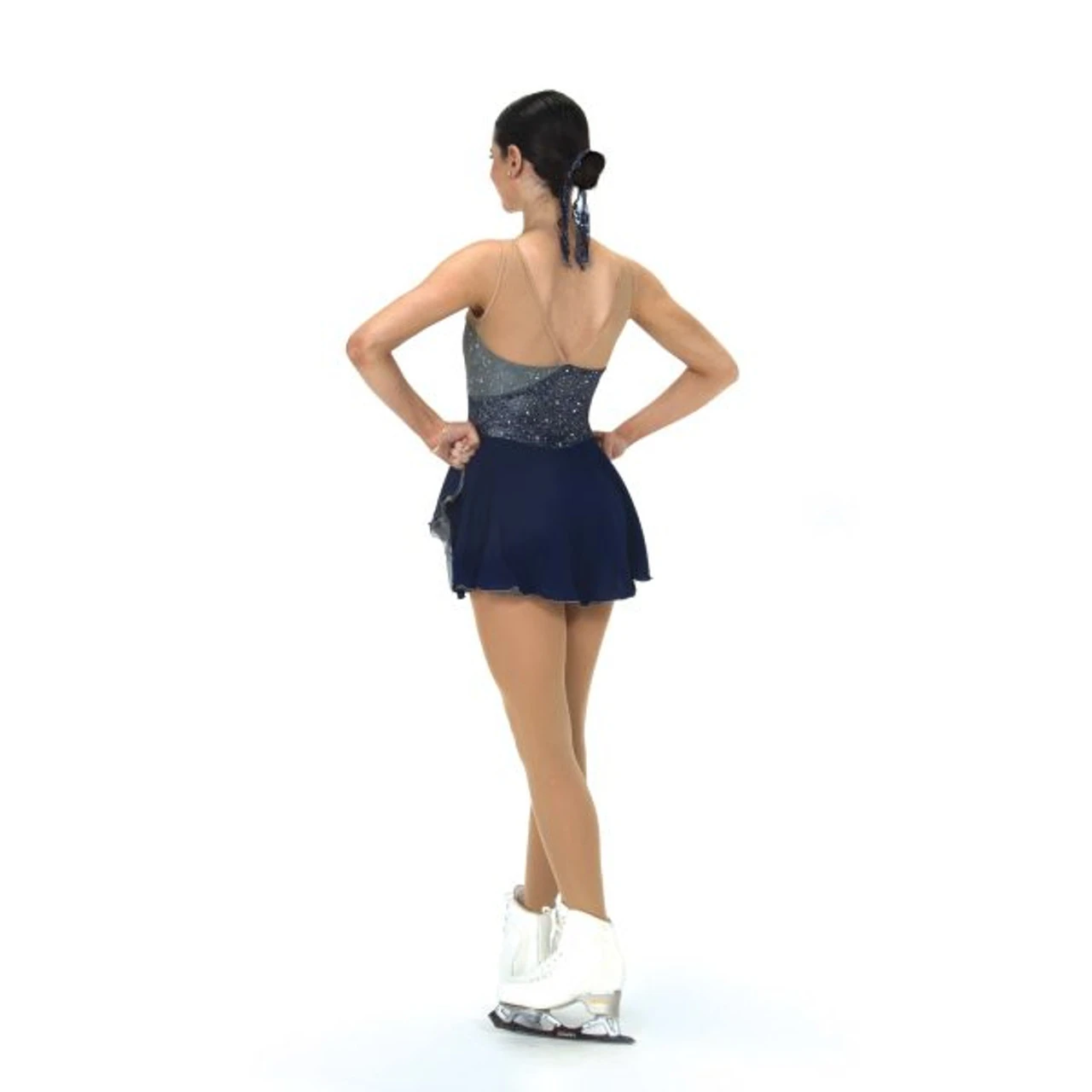 Dark navy blue lace layered over pewter grey lycra is teamed with a matching charcoal lace and a liberal sprinkling of silver glitter. The side-swept skirt of navy over charcoal echoes the flattering cut of the bodice. Lined.